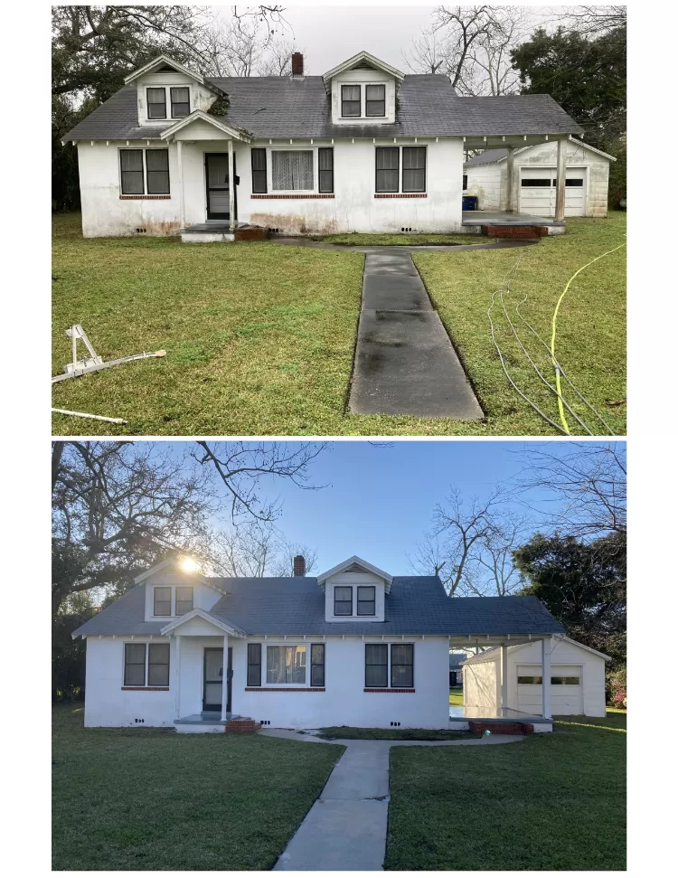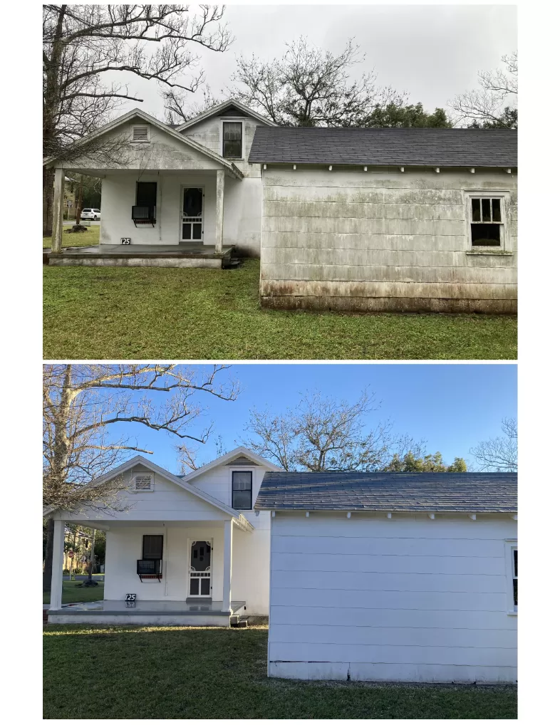 This house is located in downtown Fernandina Beach, FL on Amelia Island. This home was in desparate need of a cleaning. We soft washed the roof, removing all organic growth on the roof, especially around the dormers. We also washed the house, the detached garage, and pressure washed the concrete sidewalks. We even cleaned the gas tank in the back. The homeowner was very pleased with the results.